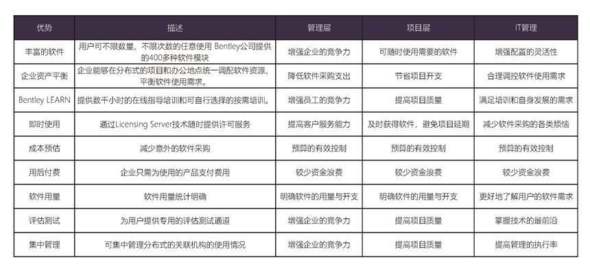 Bentley企業(yè)級(EPS-365)是幫助大中型企業(yè)或全球組織獲得運營和競爭優(yōu)勢,每年減少軟件采購成本,同時增強軟件配置的靈活性,以單一年費租用系列軟件的計劃。提供以下權(quán)益: